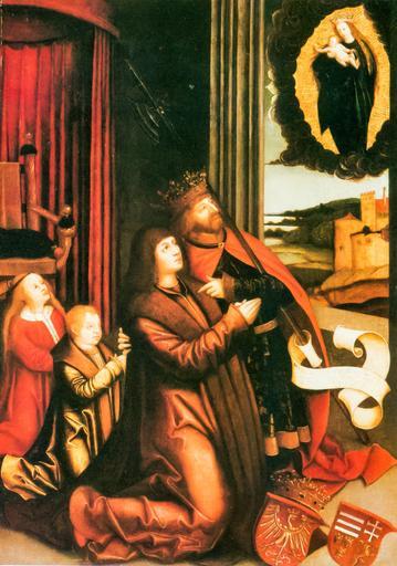 Keywords: Strigel - Saint Ladislaus requests the patronage of Virgin Mary.jpg Artwork Creator Bernhard Strigel ~ 1511 oil on canvas Museum Budapest Museum of Fine Arts Budapest object history credit line accession number own scanned by Szilas from A korona kilenc évszázada by Katona Tamás Corvina 1979 Budapest PD-old-100 Bernhard Strigel Holy Crown of Hungary in art Vladislaus II of Bohemia and Hungary 1510s oil on canvas paintings 16th-century paintings of Madonna and Child Paintings of Madonna and Child in Hungary 1510s paintings from Germany 1510s paintings in Hungary Paintings in the Budapest Museum of Fine Arts 1510s portrait paintings 16th-century oil on canvas paintings in Hungary Paintings of praying hands Patrona Hungariae Anna of Bohemia and Hungary Louis II of Hungary Paintings of Ladislaus I of Hungary