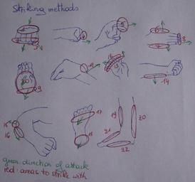 | Keywords: Striking methods (fighting).JPG A picture showing the different methods for striking a person The picture was based on a image in the book Pencak Silat by Joep Caverlé A next version of the image should include other body parts used in other martial arts as thai-boxing aikido as the forehead knee hip joint and shoulder The indicators show 1 front of the fist 2 back of the fist 3 knuckle of the thumb 4 knuckle of the middle finger 5 tip of middle and fore-finger 6 and 7 left and right side of the hand 8 tip of middle finger forefinger and ring finger stab 9 carpus 10 palm of the hand 11 wrist 12 tip of middle finger forefinger ring-finger and little finger tigerclaw 13 knuckle of middle finger forefinger ring-finger and little finger 14 fore-arm 15 back of the elbow pull 16 front of the elbow push 17 ball of the foot 18 heel 19 shin-bone calf 20 shin-bone heel 21 instep 22 foot sole and left side of the foot on left leg; right on right leg Own 2009-07-14 KVDP Martial arts technique |