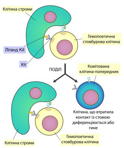 | Keywords: Stroma in haematopoiesis.svg uk Залежність гемопоетичної стовбу ової клітин від контакту із ст омальною клітиною Сп ощена схема взаємодії між гемоцитобластом та ст омальною клітиною остеобластом Взаємодія відбувається за участі ецепто ної ти озин кінази Kit на пове хні гемоцитобласта та її ліганда на пове хні ст омальної клітини Якщо гемоцитобласт вт ачає контакт із стомою він змушений дифе енціюватись або загинути шляхом апоптозу П оте невелика кількість функціональних к овотві них стовбу ових клітин може бути знайдена і у вільому стані в к ові 2011-06-09 own Zlir'a cc-zero Uploaded with UploadWizard Hematopoietic stem cells Hematopoiesis |