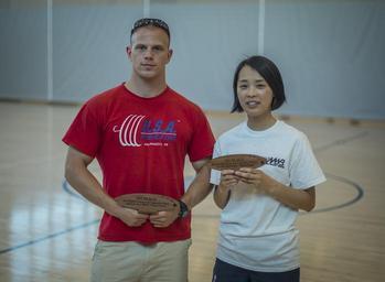 | Keywords: Strong arm competition, RIMPAC 2014 140703-N-PX130-069.jpg en Machinist's Mate Fireman Jordan Rank assigned to USS Ronald Reagan CVN 76 and Petty Officer 1st Class Ji Yee La assigned to ROKS Seoae Ryu Seong-ryong DDG 993 pose with their first place awards for the male and female groups of a strong arm competition held during Rim of the Pacific RIMPAC Exercise 2014 The world's largest international maritime exercise RIMPAC provides a unique training opportunity that helps participants foster and sustain the cooperative relationships that are critical to ensuring the safety of sea lanes and security on the world's oceans Twenty-two nations more than 49 ships six submarines more than 200 aircraft and 25 000 personnel are participating in RIMPAC U S Navy photo by Mass Communication Specialist 1st Class Daniel Gay/Released 2014-07-03 Petty Officer 1st Class Daniel Gay https //www dvidshub net/image/1439607 140703-N-PX130-069 2014-07-09 05 34 JOINT BASE PEARL HARBOR-HICKAM HI US PD-USGov-Military-Navy Sports at Pearl Harbor USS Ronald Reagan CVN-76 Seoae Ryu Seong-ryong DDG-993 RIMPAC 2014 Images from DoD uploaded by Fæ |