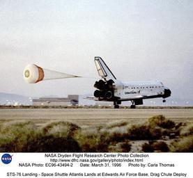 | Keywords: STS-76 Landing - Space Shuttle Atlantis Lands at Edwards Air Force Base, Drag Chute Deploy DVIDS737359.jpg en The space shuttle Atlantis touches down on the runway at Edwards California at approximately 5 29 a m Pacific Standard Time after completing the highly successful STS-76 mission to deliver Astronaut Shannon Lucid to the Russian Space Station Mir She was the first American woman to serve as a Mir station researcher Atlantis was originally scheduled to land at Kennedy Space Center Florida but bad weather there both 30 and 31 March necessitated a landing at the backup site at Edwards This photo shows the drag chute deployed to help the shuttle roll to a stop Mission commander for STS-76 was Kevin P Chilton and Richard A Searfoss was the pilot Ronald M Sega was payload commander and mission specialist-1 Mission specialists were Richard Clifford Linda Godwin and Shannon Lucid The mission also featured a spacewalk while Atlantis was docked to Mir and experiments aboard the SPACEHAB module Space Shuttles are the main element of America's Space Transportation System and are used for space research and other space applications The shuttles are the first vehicles capable of being launched into space and returning to Earth on a routine basis Space Shuttles are used as orbiting laboratories in which scientists and mission specialists conduct a wide variety of scientific experiments Crews aboard shuttles place satellites in orbit rendezvous with satellites to carry out repair missions and return them to space and retrieve satellites and return them to Earth for refurbishment and reuse Space Shuttles are true aerospace vehicles They leave Earth and its atmosphere under rocket power provided by three liquid-propellant main engines with two solid-propellant boosters attached plus an external liquid-fuel tank After their orbital missions they streak back through the atmosphere and land like airplanes The returning shuttles however land like gliders without power and on runways Other rockets can place heavy payloads into orbit but they can only be used once Space Shuttles are designed to be continually reused When Space Shuttles are used to transport complete scientific laboratories into space the laboratories remain inside the payload bay throughout the mission They are then removed after the Space Shuttle returns to Earth and can be reused on future flights Some of these orbital laboratories like the Spacelab provide facilities for several specialists to conduct experiments in such fields as medicine astronomy and materials manufacturing Some types of satellites deployed by Space Shuttles include those involved in environmental and resources protection astronomy weather forecasting navigation oceanographic studies and other scientific fields The Space Shuttles can also launch spacecraft into orbits higher than the Shuttle's altitude limit through the use of Inertial Upper Stage IUS propulsion units After release from the Space Shuttle payload bay the IUS is ignited to carry the spacecraft into deep space The Space Shuttles are also being used to carry elements of the International Space Station into space where they are assembled in orbit The Space Shuttles were built by Rockwell International's Space Transportation Systems Division Downey California Rockwell's Rocketdyne Division now part of Boeing builds the three main engines and Thiokol Brigham City Utah makes the solid rocket booster motors Martin Marietta Corporation now Lockheed Martin New Orleans Louisiana makes the external tanks Each orbiter Space Shuttle is 121 feet long has a wingspan of 78 feet and a height of 57 feet The Space Shuttle is approximately the size of a DC-9 commercial airliner and can carry a payload of 65 000 pounds into orbit The payload bay is 60 feet long and 15 feet in diameter Each main engine is capable of producing a sea level thrust of 375 000 pounds and a vacuum orbital thrust of 470 000 pounds The engines burn a mixture of liquid oxygen and liquid hydrogen In orbit the Space Shuttles circle the earth at a speed of 17 500 miles per hour with each orbit taking about 90 minutes A Space Shuttle crew sees a sunrise or sunset every 45 minutes When Space Shuttle flights began in April 1981 Dryden Flight Research Center Edwards California was the primary landing site for the Shuttles Now Kennedy Space Center Florida is the primary landing site with Dryden remaining as the principal alternate landing site NASA Identifier NIX-EC96-43494-2 2009-09-23 Glenn Research Center https //www dvidshub net/image/737359 737359 2012-10-17 23 02 WASHINGTON DC US PD-USGov Landing of STS-76 Images from DoD uploaded by Fæ Space Shuttle parachutes |