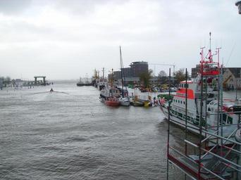 | Keywords: Sturmflut in Bremerhaven Geeste.jpg Blick auf die Geeste in Bremerhaven während einer Sturmflut am 09 11 2007 Der Anleger für die Schiffe des Wasser- und Schifffahrtsamtes und des Seenotrettungskreuzers und der Tonnenhof mit den Seezeichen sind überflutet ebenso der Anleger der Weserfähre hinten links View of the river Geeste in Bremerhaven Germany during a storm tide on 9 November 2007 The landing place of the ships of the water street authority and the sea rescue service is being flooded The same applies to the landing place of the Weser ferry Own 2007-11-09 Garitzko Storm_tide_in_Bremerhaven Geeste river |