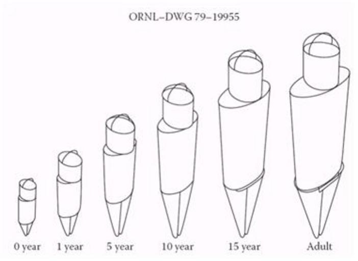 | Keywords: Stylized Phantom - Various Ages.jpg en External views of the age-specific phantom phantoms representing an adult and children at 15 adult female 10 5 1 and 0 newborn years of age When used for an adult female the 15 year phantom has breasts appropriate for a reference adult female which are not shown 2011-05-20 Oak Ridge National Laboratory M Christy Governmental Public Release PD-USGov Uploaded with UploadWizard human computational phantom nuclear medicine Computer modelling | ||||