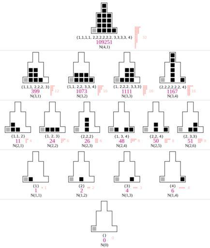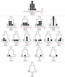 Keywords: Subgroups of Z2^4; digit weights in equivalence classes.svg v Subgroups of nimber addition Z24 The equivalence classes can be defined by multisets of their positive digit weights <br> They correspond to some integer partitions denoted by their index in A194602 shown in violet <br> Compare right column in this table The higher indices are taken from https //oeis org/A194602/a194602 txt this table where the values are +1 The 1 4 6 4 1 pattern in the vertices is from Pascal's triangle the 1 4 6 4 1 pattern of the whole structure is from A076831 own Mate2code Subgroups of nimber addition Binomial coefficients Integer partitions Cc-zero |