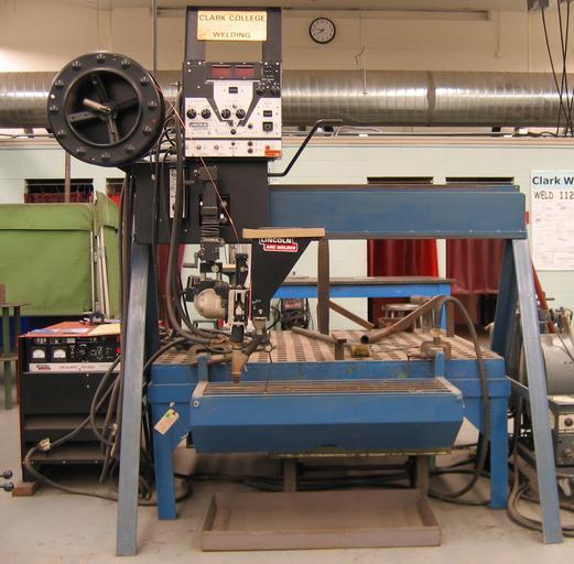 | Keywords: Submerged arc welder.lincoln.triddle.jpg Submerged arc welding Welding equipment Triddle A Lincoln Submerged Arc Welding machine The blue support structure for this machine stands 56 in 1 4 m tall 68 in 1 7 m wide and 80 in 2 m deep The copper colored wire going from the top of the machine to the middle is 1/8 in 3 mm steel welding electrode The welder utilizes a 600 amp CC/CV welding power supply pictured on the left Meta This photograph was taken inside the Clark College welding lab See Also Close-up of the control panel |