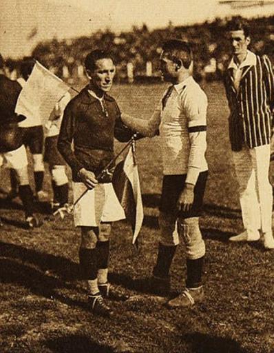 Keywords: Sudamericano de football Chile - Argentina (1926).JPG en Arellano y Vaccaro capitanes de ambos cuadros se cambian un afectuoso saludo Articulo de la revista Los Sports titulado Noveno campeonato sudamericano de football Octavo lance Argentina contra Chile 31 de octubre de 1926 http //www memoriachilena cl/602/w3-article-124404 html Desconocido - Revista Los Sports 1926 PD-old PD-Chile David Arellano Los Sports |