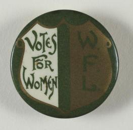 | Keywords: the women's library thewomenslibrary hires round circle indoor text TWL.2004.601Badge, paper, plastic, metal, round, paper, produced by Women's Freedom League, printed with a gold, green and white shield, left side of shield white with green printed inscription: 'Votes for Women', right side of shield gold with green printed inscription: 'WFL', paper covered with plastic, over metal base. Paper disc in reverse, printed 'T[ait] Co, [Kentish] Town Rd, London NW' TWL.2004.601Badge, paper, plastic, metal, round, paper, produced by Women's Freedom League, printed with a gold, green and white shield, left side of shield white with green printed inscription: 'Votes for Women', right side of shield gold with green printed inscription: 'WFL', paper covered with plastic, over metal base. Paper disc in reverse, printed 'T[ait] Co, [Kentish] Town Rd, London NW' |
