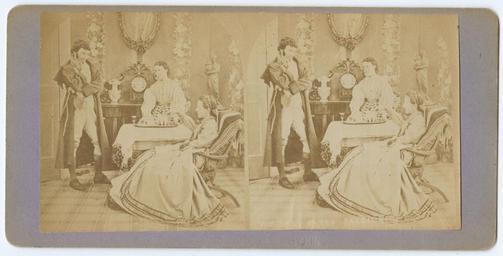 Keywords: stereographs tea sugar parlors genre stereographs genrestereographs sketch drawing photo border illustration Genre stereograph showing two women and a man having tea in a parlor. One woman sits in a chair in front of the tea service, her hand hovering above a sugar pot. The other, younger woman stands behind the table, looking toward the handsome young man who faces them. Accession number: P.2011.47.1521a Genre stereograph showing two women and a man having tea in a parlor. One woman sits in a chair in front of the tea service, her hand hovering above a sugar pot. The other, younger woman stands behind the table, looking toward the handsome young man who faces them. Accession number: P.2011.47.1521a |