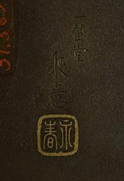 Keywords: Sugiura Jôi - Tsuba with the Legendary Chinese ruler Shinnô - Walters 51369 - Mark A.jpg The Chinese sage Shinnô Ch Shen Nong Shen Nung is on the right side of the tsuba eating a blade of grass He has two small horns on his head Shinnô is credited with inventing the plow and the harp He also expanded the number of ideograms for the written language from eight to sixty-four On the reverse is a mountain landscape between 1701 1761 mid Edo copper gold sentoku cm 8 9 accession number 51 369 14451 Henry Walters Baltimore date and mode of acquisition unknown Walters Art Museum Henry Walters Acquired by Henry Walters Signature Issandô Jûi kao ; Seal Nagaharu place of origin Edo present-day Tokyo Japan Walters Art Museum license Tsuba in the Walters Art Museum Sugiura Jôi Media contributed by the Walters Art Museum needs category review Shennong |