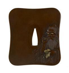 Keywords: Sugiura Jôi - Tsuba with the Legendary Chinese ruler Shinnô - Walters 51369.jpg The Chinese sage Shinnô Ch Shen Nong Shen Nung is on the right side of the tsuba eating a blade of grass He has two small horns on his head Shinnô is credited with inventing the plow and the harp He also expanded the number of ideograms for the written language from eight to sixty-four On the reverse is a mountain landscape between 1701 1761 mid Edo copper gold sentoku cm 8 9 accession number 51 369 14451 Henry Walters Baltimore date and mode of acquisition unknown Walters Art Museum Henry Walters Acquired by Henry Walters Signature Issandô Jûi kao ; Seal Nagaharu place of origin Edo present-day Tokyo Japan Walters Art Museum license Tsuba in the Walters Art Museum Sugiura Jôi Media contributed by the Walters Art Museum needs category review Shennong |