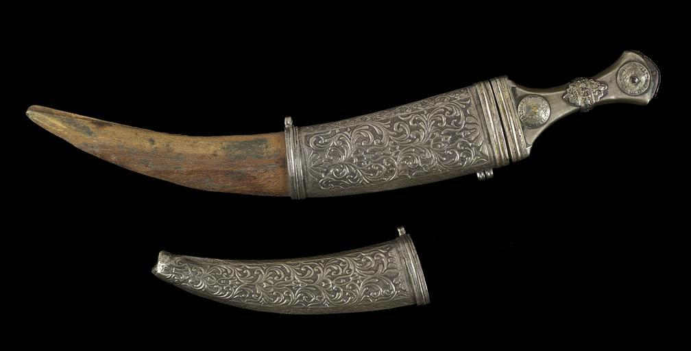 | Keywords: Sulayman Salih - Thuma - Walters 511451 (2) (3).jpg The sheath is created from two pieces each with a buckle at the end and several loops on the side and back for attaching it to the girdle The front of the sheath is decorated with an arabesque leaves and tendril pattern The blade is fixed in the wooden handle with two pins which end in round decorative plaques made from coins Between the two plaques is a rhombic-shaped element on a band which closes at the back The back of both parts of the sheath have each an Arabic stamp with the date nusfi 1267; nusfi means half This date belongs either to the reign of al-Mutawakkil Ali AH 1267 or al-Mansur Ahmad AH 1266-1267 An engraved Hebrew inscription names the silversmith Sulayman Salih mahasit The term mahasit means half 1267 AH/AD 1850-1851 silver with gilding and wood Overall L 22 1/16 x W 16 1/8 in 56 x 41 cm ; L of blade 11 x W of blade 18 7/8 in 28 x 48 cm accession number 51 1451 80932 Mr Benjamin Zucker Zucker Family Trust and Mr Derek Content New York and London by purchase Walters Art Museum Joint gift to the Walters Art Museum Baltimore and the Israel Museum Jerusalem by Mr Benjamin Zucker and Mr Derek Content in honor of Mrs Barbara Zucker and Mrs Amanda Content 2010 Stamp Arabic nusfi 1267 Engraving Hebrew Sulayman Salih mahasit place of origin between Taizz and Sana'a <gallery> File Sulayman Salih - Thuma - Walters 511451 jpg File Sulayman Salih - Thuma - Walters 511451 2 jpg </gallery> Walters Art Museum license Weapons in the Walters Art Museum South Arabian art in the Walters Art Museum Sulayman Salih Media contributed by the Walters Art Museum needs category review |