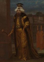 Keywords: Sultan Mahmud I – Jean Baptiste Vanmour.jpg (cropped).jpg Artwork Creator Jean Baptiste Vanmour en 24th Sultan and 103rd Calip of Islam Mahmud I 1696 “1754 De sultan is geportretteerd in de open lucht vergezeld door twee dienaren Op de achtergrond zien we enkele gebouwen Mogelijk moet dit het haremgedeelte van het paleis van de sultan het Topkapı Sarayı voorstellen Ahmed III draagt een met bont gevoerde kaftan en een tulband die kâtibî wordt genoemd Dit type tulband was gedrapeerd rondom een plat hoofddeksel en versierd met een waaiervormig sieraad Ook de ceintuur van de sultan is rijk bezet met juwelen evenals de ceremoniële staf die hij in zijn rechterhand vasthoudt Staande ten voeten uit scepter in de rechterhand Op de achtergrond twee volgelingen voor het paleis ~ 1730 1737 oil canvas cm 33 5 26 5 Institution Rijksmuseum place of discovery object history exhibition history credit line accession number SK-A-2014 place of creation https //www rijksmuseum nl/en/search/objecten q Sultan p 1 ps 12 ii 3 /SK-A-2014 3 Rijksmuseum Sultan Mahmud I “ Jean Baptiste Vanmour jpg Custom license marker 2015 09 13 PD-old-100 Uploaded with UploadWizard Mahmud I Paintings by Jean Baptiste Vanmour Paintings by Jean Baptiste Vanmour with fur Turkish paintings in the Rijksmuseum Amsterdam Fur clothing of native people of Turkey Paintings of men of Turkey |