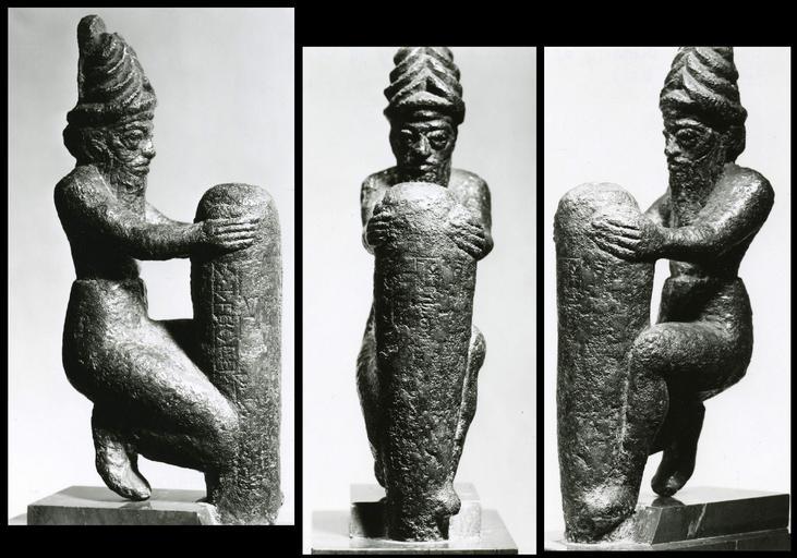 Keywords: Sumerian - Deity Holding a Foundation Peg - Walters 54790 - View A.jpg A deity wearing a divine horned headdress kneels with a foundation peg inscribed with King Gudea's name Though the inscription is mostly defaced it was probably dedicated to the Ningirsu god of the city of Lagash ca 2100 BC Neo-Sumerian cast bronze cm 17 7 4 3 7 2 accession number 54 790 7006 Joseph Brummer New York Henry Walters city Baltimore Walters Art Museum Henry Walters Acquired by Henry Walters 1923 Inscription includes name of King Gudea place of origin Imgur-Enlil present-day Balawat Iraq Walters Art Museum license Ancient Near East art in the Walters Art Museum Art of Sumer Media contributed by the Walters Art Museum needs category review |