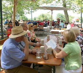 Keywords: summer beer garden celebrate human beer dining tables sit chairs benches cozy eat drink after work rest leisure outside catering