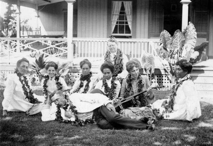 Keywords: Summer vacation, Hāna, Maui, 1902.jpg en Summer vacation Hāna Maui 1902 Lydia K Aholo is four from the left Ida Pope sitting on chair and Ida's sister Katherine Pope holding the guitar H C Ovenden British bookkeeper for Heeia Sugar Plantation on grass in front Photograph unknown Courtesty of Bishop Museum Bonura Sandra; Witmer Sally 2013 Lydia K Aholo Her Story Recovering the Lost Voice The Hawaiian Journal of History Honolulu Hawaiian Historical Society 47 133 hdl 10524/36266 OCLC 60626541 Author ~ 1902 PD-old Lydia Kaʻonohiponiponiokalani Aholo Ida May Pope 1902 in Hawaii Hana Hawaii Photographs in the Bernice Pauahi Bishop Museum