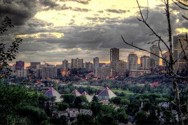 Keywords: edmonton canada alberta muttart build outdoor solid park view peace urban trees landmark attraction symbol sunny scenery summer serene simple modern reflection architecture city blue reflecting pyramid greenhouse