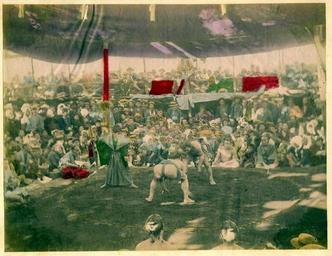 Keywords: Sumo match 1890s.jpg Two japanese sumo wrestlers waiting for the initial charge with a young boy acting as referee Hand-colored albumen photograph by unknown photographer 1890s Black and white photographs of sumo PD-Art Artworks missing infobox template |