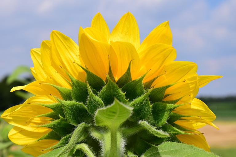 Keywords: sun flower close yellow blossom bloom partially receptive section sky back from the rear