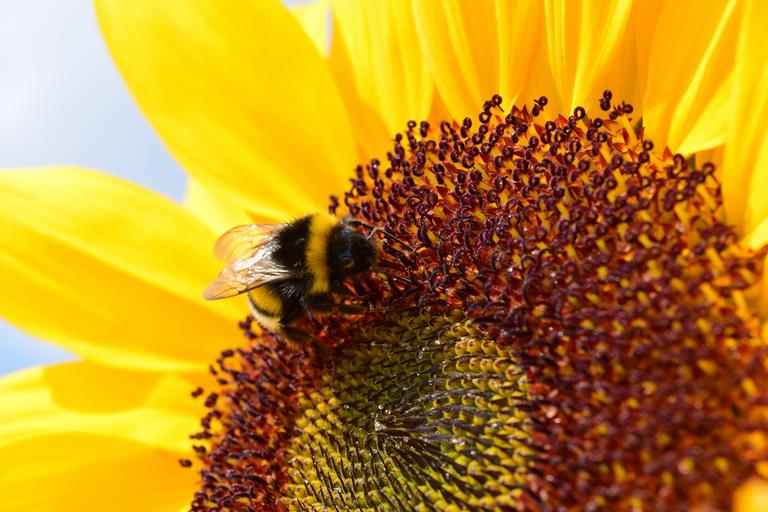 Keywords: sun flower hummel blossom bloom summer yellow helianthus insect nature pollination close pollen sunny