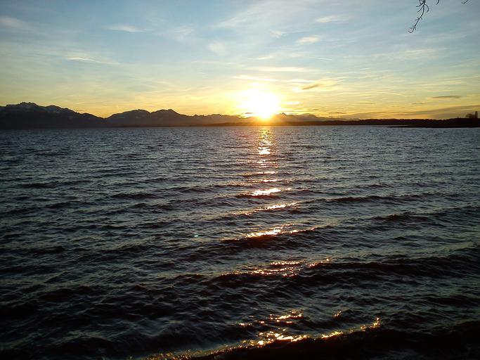 Keywords: sun sunset afterglow evening abendstimmung sky water wave lake bank mountains lighting landscape upper bavaria chiemsee peaceful