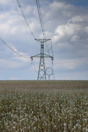 Keywords: sun transmission tower wires lines tall summer industry light fields poppies sky clouds blue