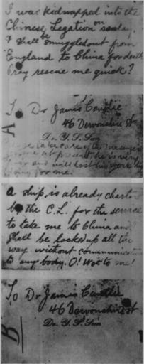 | Keywords: Sun Yar Sen's two short letters to his teacher James Cantile.png English Dr Sun's two short letters to his teacher Dr James Cantile of the College of Medicine for the Chinese Hong Kong Sun Yat Sen is the father of China and died at 1925 therefore the photo must be in public domain Sources Sun Yat-Sen In commemoration of the 130th anniversary of Dr Sun's birth Edited by Shanghai Museum of Sun Yat-Sen's Former Residence 中文︰ 是孫中山先生 敦被清政 困禁時,向其於香港西醫書院就學時的 師康德黎 寫的兩封求救短信 孫中山為中 父,並於1925年辭世,因此 張照片現 屬於公 領域 來源︰孫中山 念孫中山先生誕辰130 年 上海孫中山故居 念館編 Sun Yat-sen PD-old |