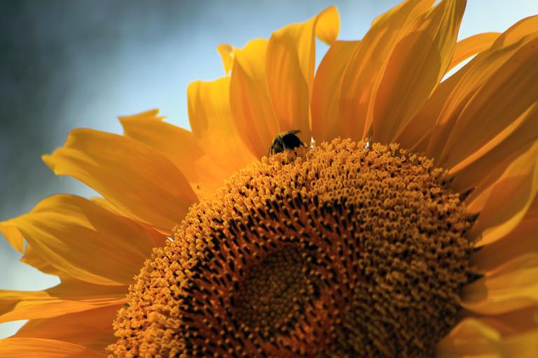Keywords: sunflower bee summer sunshine colorful petals profile orange yellow brown morning sunrise flower