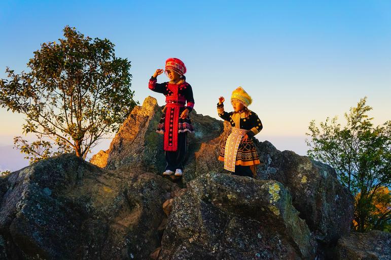Keywords: sunrise children child kid sky people traditional clothing hat looking sun rock shadow sunlight together thailand phu chi fa laos border nature outdoor light holiday yellow red orange blue thai asia