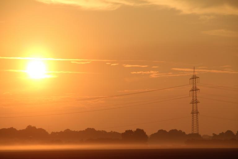 Keywords: sunrise fog skies morgenrot sun strommast clouds atmospheric energy orange landline power lines cable power supply field