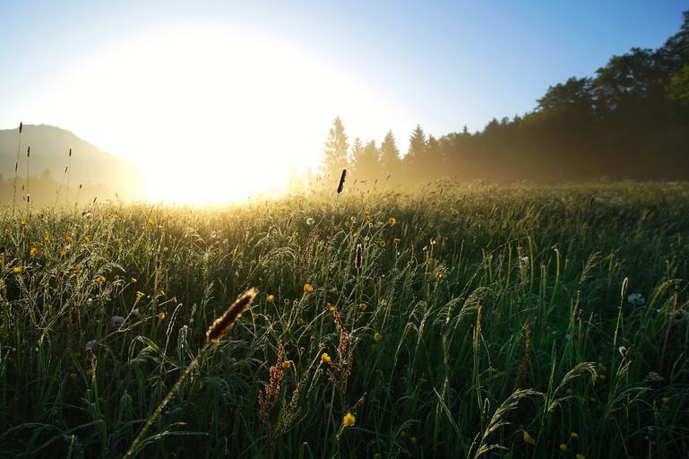 Keywords: sunrise meadow sun morning sky forest flowers landscape nature back light morgenstimmung gold atmospheric morning light skies atmosphere mood heat light grasses dew sunshine spring bright lichtspiel beauty color colorful frisch