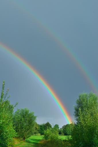 Keywords: sunrise rainbow good morning friendly skies morgenstimmung romantic meadow nature mood sky idyll landscape green lights