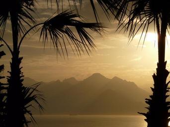 Keywords: sunset antalya sea outlook palm trees idyll holiday ocean mountains sunbeam turkey turkish riviera cliff postkartenmotiv
