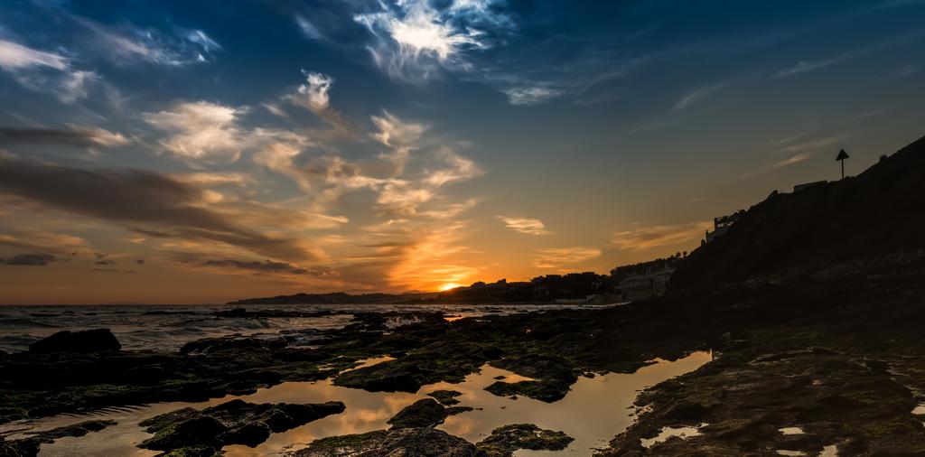 Keywords: sunset beach costa blue sky orange waves clouds mijas malaga andalusia spain highlights rays sun