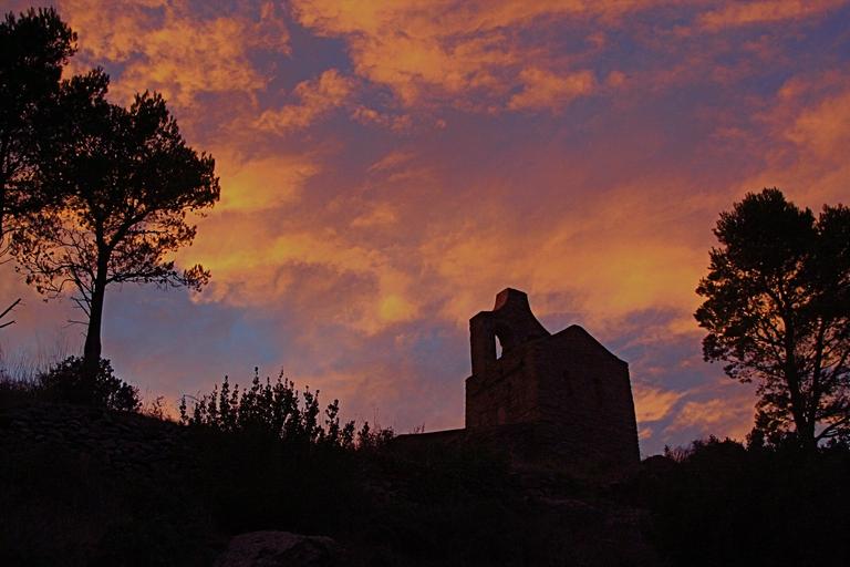 Keywords: sunset colorful silhouette building ruins monastery landscape sky clouds trees evening dusk twilight scenic