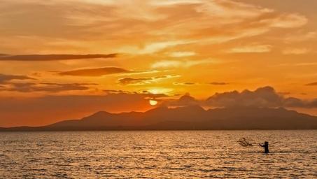 Keywords: sunset lagoon fishing sea water mountains landscape child island coast seascape