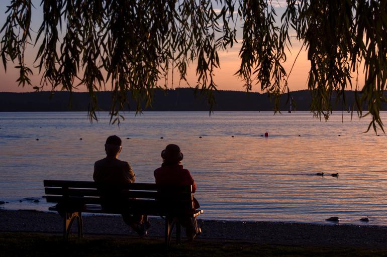Keywords: sunset lake constance unteruhldingen lake bank sit abendstimmung enjoy mood bench evening idyll silhouette seat relax