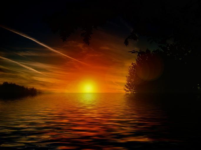 Keywords: sunset lake water wave sky clouds orange red still nature landscape rest