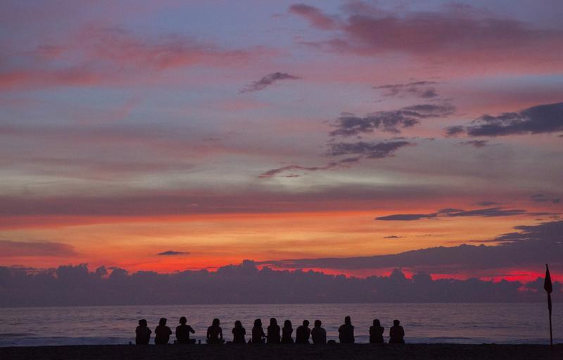 Keywords: sunset people watching silhouettes sitting beach ocean shore sea coast glow evening scene summer holidays group vacation twilight dusk cloudscape