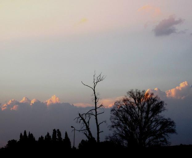 Keywords: sunset pink sky clouds ridge of light highlighted glow trees light