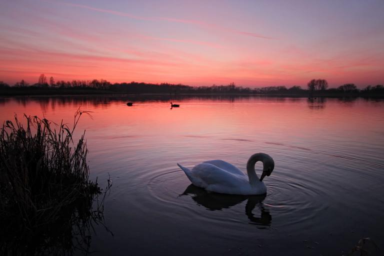 Keywords: sunset red sky lake swan bird sun nature landscape summer evening orange big water natural scenic beautiful scene