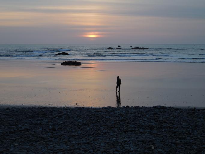 Keywords: sunset seashore seascape sky coast beach solitary figure silhouette profile water reflection sea ocean sand landscape nautical maritime scenic tranquil twilight evening horizon sun setting west sunlight outdoors peaceful serenity rocks