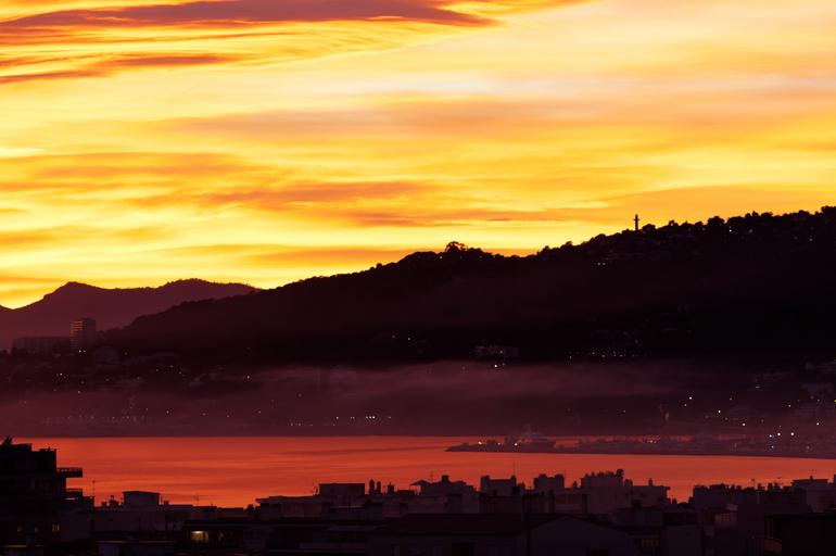 Keywords: sunset sky colorful hills ocean sea orange yellow harbor mountains dusk twilight water haze fog clouds city urban cityscape buildings lights illumination scene evening hazy