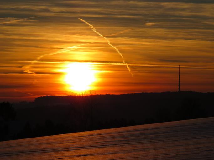 Keywords: sunset sun sky clouds snow golden sparkle snow landscape ulm eselsberg radio tower arnegg contrail