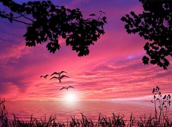 Keywords: sunset water grass sky abendstimmung sea afterglow clouds gulls sun evening sky romance summer mood