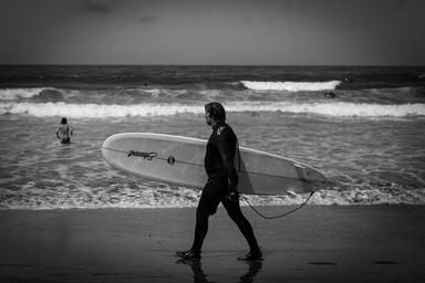 Keywords: surfer surf surfboard waves black and white monochrome surfing ocean beach summer board male man wetsuit leisure person outdoor sport