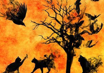 Keywords: surreal scene atmosphere mystical secret magic gloomy fantasy cat silhouette
