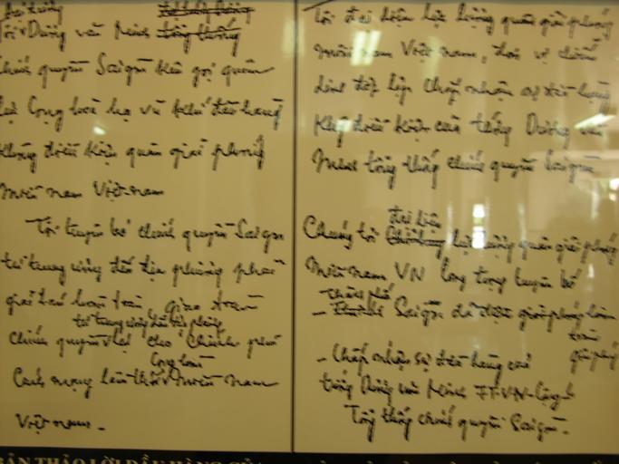 Keywords: Surrender letter of Duong Van Minh.JPG Surrender and acceptance letters by Giai phong's officers Phạm Xuân Thệ and Bùi Văn Tùng read by Duong Van Minh on April 30 1975 Thư tuyên bố đầu hàng và chấp nhận đầu hàng do hai sĩ quan quân Giải phóng là Phạm Xuân Thệ và Bùi Văn Tùng soạn Tổng thống Dương Văn Minh đọc vào ngày 30 tháng 4 năm 1975 Own 2008-04-13 Vinhtantran This document is not copyrighted because it only has normal characters' scripts and is displayed in many museums in Vietnam Reunification Palace Vietnam War in 1975 1975 documents April 1975 Surrendering |