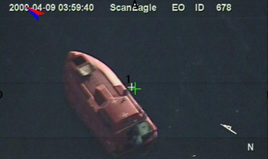 Keywords: Surveillance photo of Maersk Alabama lifeboat, hijacked by pirates 090409-N-0000X-926.jpg 090409-N-0000X-926 INDIAN OCEAN April 9 2009 In a still frame from video taken by the Scan Eagle unmanned aerial vehicle a 28-foot lifeboat from the U S -flagged container ship Maersk Alabama is seen in the Indian Ocean U S Navy Photo http //www navy mil/view_image asp id 70450 Navy News Servicehttp //www navy mil/management/photodb/photos/090409-N-0000X-926 jpg Hi-Res Version 2009-04-09 US Navy Scan Eagle UAV PD-USGov-Military-Navy USS Bainbridge DDG-96 Maersk Alabama lifeboat Boeing ScanEagle Still images from videos Photos and video from unmanned aerial vehicles |