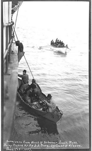| Keywords: Survivors from wreck of schooner JOSEPH RUSS boarding steamer DORA, off Chirikof Island, April 1912 (THWAITES 161).jpeg check categories 27 October 2016 3 Photograph Creator John E Thwaites Caption on image Survivors from wreck of schooner Joseph Russ being picked up by SS Dora off coast of Alaska PH Coll 247 290<br/>The codfishing schooner JOSEPH RUSS struck the rocks off Chirikof Island on April 21 and was totally demolished First Mate J Jorgensen being drowned Capt Charles Foss and the remaining 29 men of the crew reached the island where they were in danger of death through cold and starvation Second Mate A E Reeve and five volunteers put out in two small boats to seek assistance battling for 11 days through constant storms to reach Chignik arriving two hours before the steamer DORA Capt C B McMullen of the DORA ordered his vessel to the scene of the RUSS wreck which was reached the following evening Although the midnight sun allowed rescue work to proceed throughout the night it required 12 hours to remove the shipwrecked fishermen safely to the DORA Notes from Gordon Newell ed The H W McCurdy Marine History of the Pacific Northwest Seattle Superior Publishing Co 1966 Subjects LCTGM Dora Ship ; Rescues--Alaska; Pacific Ocean Subjects LCSH Steamboats--Alaska--Chirikof Island; ; Shipwreck victims--Alaska--Chirikof Island; Lifeboats--Alaska--Chirikof Island; Survival after airplane accidents shipwrecks etc --Alaska--Chirikof Island depicted place United States--Alaska--Chirikof Island 1912 Institution University of Washington UWASH-THWAITES-source accession number thwaites 161 PD-old-auto-1923 1940 Information field Order Number THW149 Images from the John E Thwaites Photographs of Alaska Collection to check Pacific Ocean Steamboats of Alaska Lifeboats |