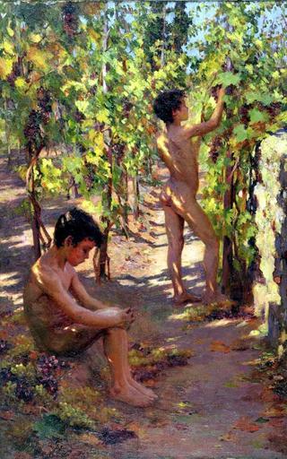 | Keywords: Susan Watkins (1875-1913), Boys picking grapes at Capri (ca. 1906).jpg Artwork Creator Susan Watkins 1906 oil on canvas cm 79 4 52 1 Institution The Chrysler Museum Norfolk 46 76 139 credit line Bequest of Goldsborough Serpell object history The artist Susan Watkins Serpell bequeathed to her husband Goldsborough Serpell 1913; Bequest of Goldsborough Serpell to the Norfolk Museum of Arts and Sciences 1946; Norfolk Museum of Arts and Sciences transferred to the Chrysler Museum 1971 Signed and dated lower left 1906 http //collection chrysler org/emuseum/view/objects/asitem/search 0040/5/title-asc t state flow 0ddf0b5b-7df7-458f-906a-9130287ec509 The Chrysler Museum http //www lesdiagonalesdutemps com/article-susan-105131214 html PD-old-auto-1923 1913 Susan Watkins Paintings in the Chrysler Museum of Art Paintings of Capri Paintings of nude boys Paintings of nude standing males 1906 paintings Two boys in art Sitting boys in art Standing boys in art Boys' buttocks in art |